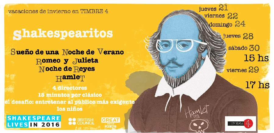 En está ocasión Timbre 4 quiere homenajear a uno de los padres del Teatro: William Shakespeare en el 400 aniversario de su natalicio, es por eso que hemos creado el ciclo “Shakespeare para niños”, creemos que es imprescindible acercarle a los chicos al más grande de todos los tiempos.