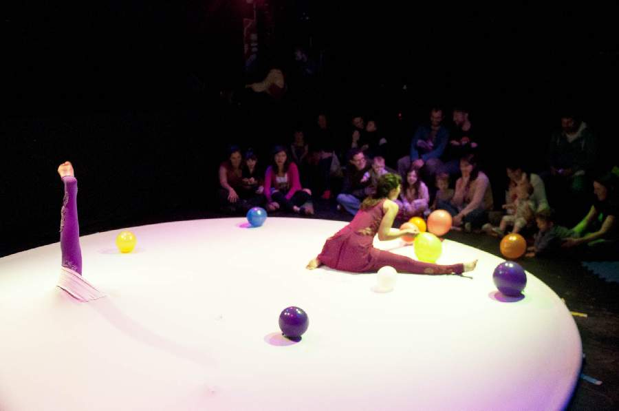 Dos intérpretes debajo de un gran aro de tela juegan y descubren partes de su cuerpo que por primera vez asoman, exploran y se encuentran.